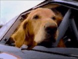 Heffer, the dog, wants to feel the wind while he rides along with Dale Earnhardt.